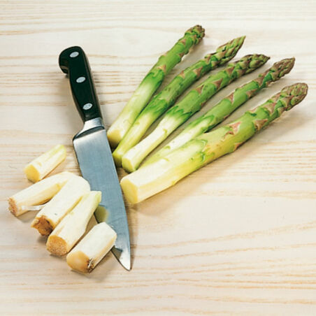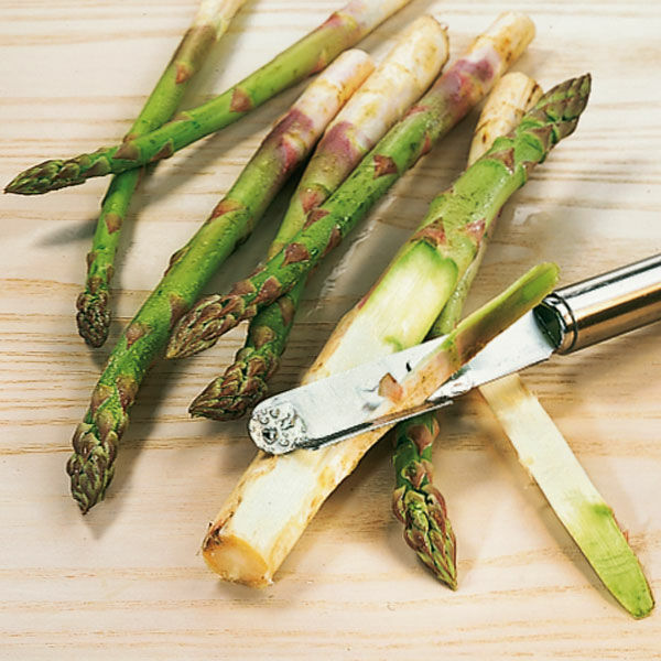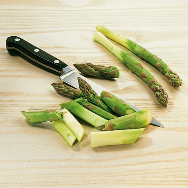 Den Spargel waschen, nur im unteren Drittel schälen (Step 1) und die Enden abschneiden (Step 2). Die Stangen in 4 cm lange Stücke schneiden (Step 3).