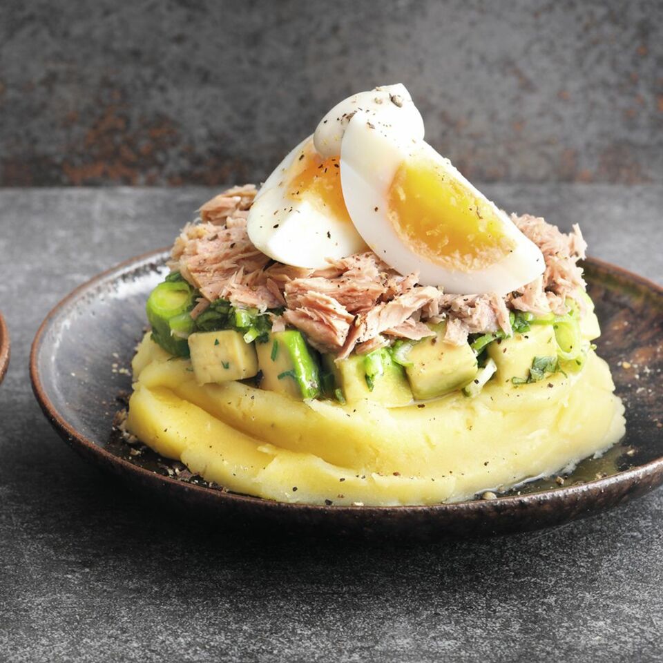 Diese exotische Vorspeise aus Peru ist ein Schichtsalat der anderen Art: Avocado, Fisch, Eier und Mayo werden auf Kartoffelpüree geschichtet.