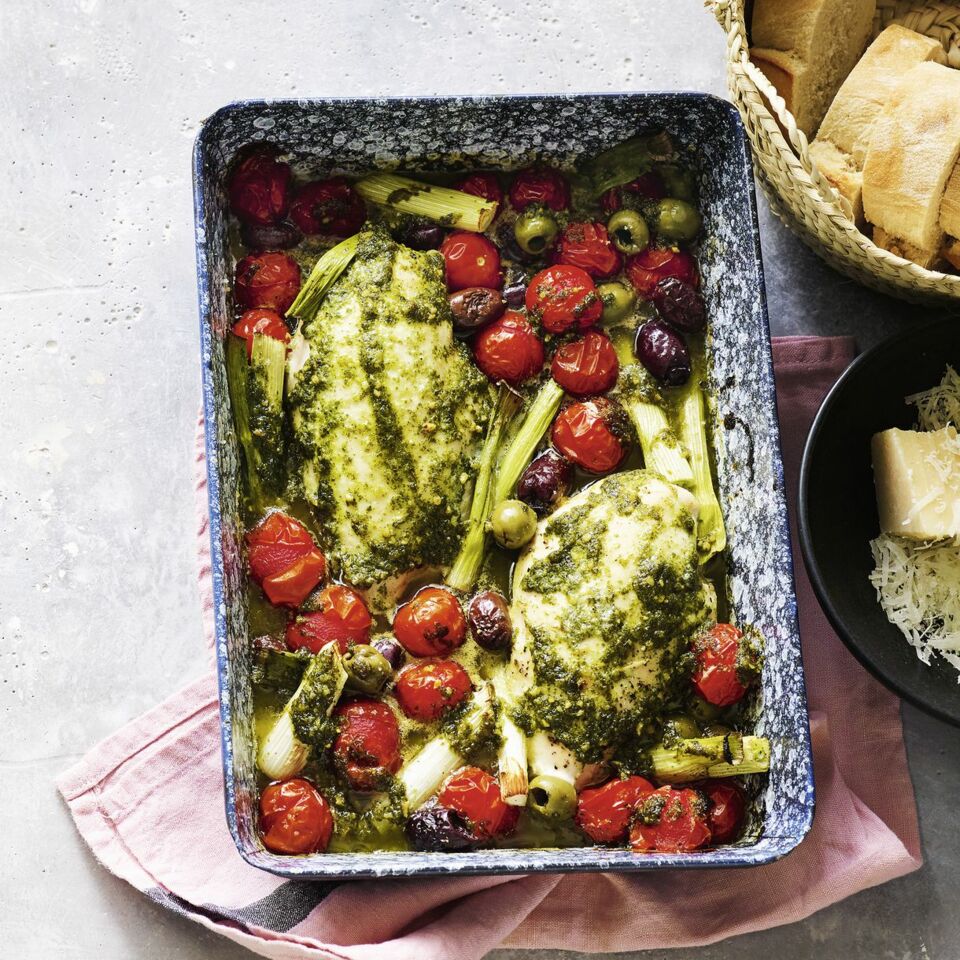 Den Backofen auf 200° vorheizen. Die Hähnchenbrustfilets trocken tupfen und nebeneinander in eine große Auflaufform (28 cm Ø oder 30 × 20 cm) legen. Die Tomaten waschen und um die Filets herum verteilen. Frühlingszwiebeln waschen, putzen, in grobe Stücke schneiden und mit den Oliven ebenfalls in die Form geben. Alles mit Salz und Pfeffer würzen.
