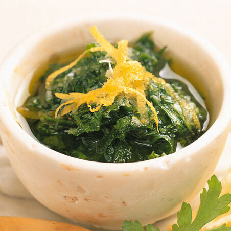 Petersilie waschen, trocken schütteln. Blättchen abzupfen und 30 g abwiegen. Pinienkerne in einer Pfanne ohne Fett goldgelb rösten. Knoblauch schälen und grob hacken. Zitrone heiß waschen und trocknen. Die Schale hauchdünn abziehen und fein hacken, 1-2 TL Saft auspressen.