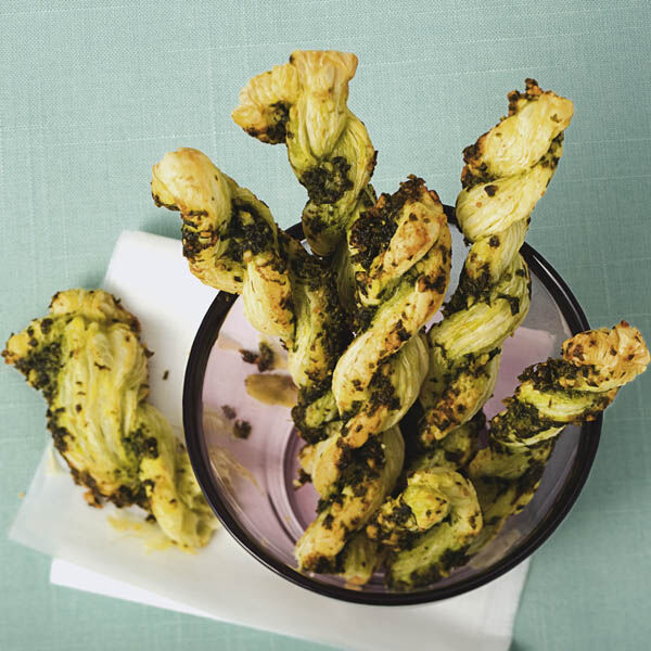 Backofen auf 200° vorheizen. Backpapier auf die Arbeitsfläche legen, die Hälfte des Pesto darauf verstreichen. Teigplatten darauflegen und 5 Min. antauen lassen. Den Rest Pesto auf den Teigplatten verstreichen und mit Salz und Pfeffer würzen.