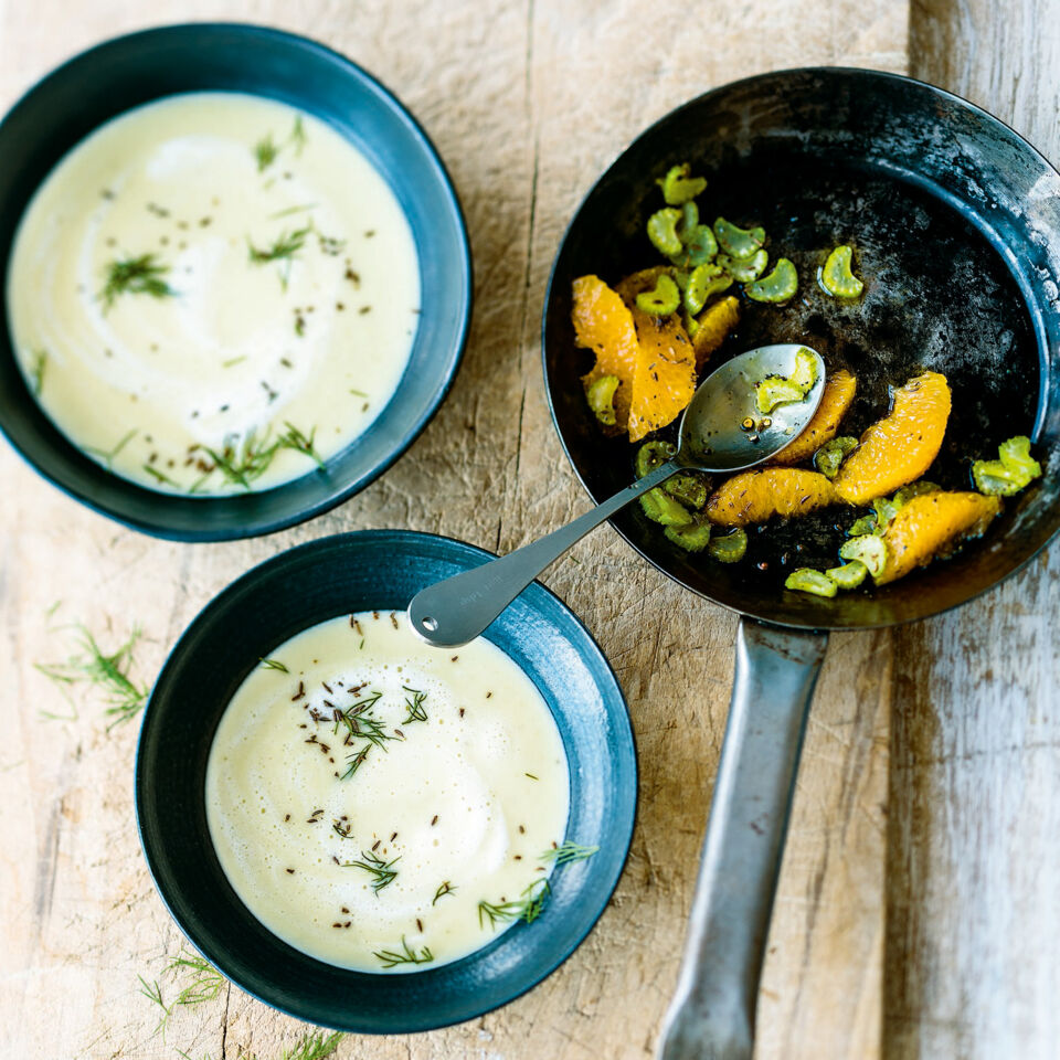 Inzwischen in einer Pfanne ohne Fett die Kümmelsamen rösten, bis sie duften, und im Mörser grob zerstoßen. Die Orangen bis ins Fruchtfleisch hinein schälen und die Filets zwischen den Trennhäutchen herauslösen. Die übrige Selleriestange in feine Scheibchen schneiden. In einer Pfanne die Selleriescheibchen in dem übrigen EL Butter andünsten und mit Salz, Pfeffer und dem zerstoßenen Kümmel würzen. Dann die Orangenfilets untermischen.