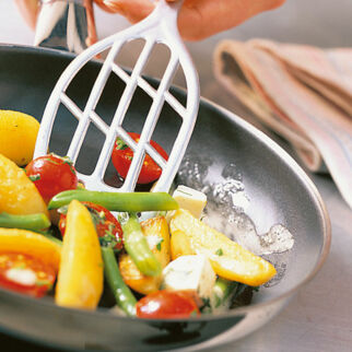 Wir kaufen schwarze Oliven mit Stein, weil sie einfach besser schmecken. Und entsteinen sie auch nicht für die Pfannen-Niçoise, aber das kannst du natürlich machen. Man kann auch noch 2 Sardellenfilets (in Öl) dazu: abtropfen lassen, klein hacken und untermischen. Und wer mag, streut vor dem Servieren Basilikumblätter auf das Gemüse.