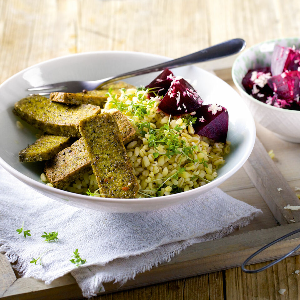 Eine raffinierte Kombination aus würzigem Tofu, nussigem Weizen und erdiger Roter Bete. Unbedingt probieren!