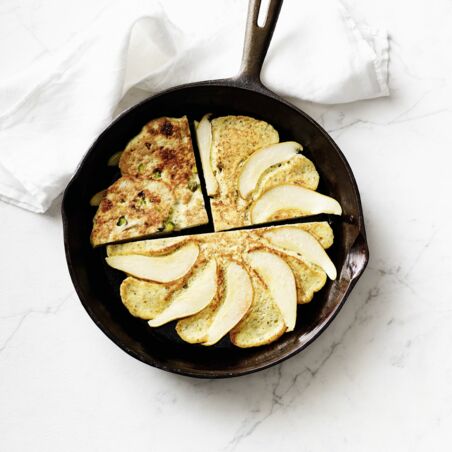 In einer beschichteten Pfanne (Ø 26 cm) 1 EL Butter schmelzen. Die Hälfte der Birnenspalten kreisförmig hineinlegen. Die halbe Menge Teig daraufgeben und mit einem Küchenspatel verstreichen. Mit 1 EL Pistazien bestreuen und abgedeckt bei schwacher Hitze ca. 5 Min. backen.