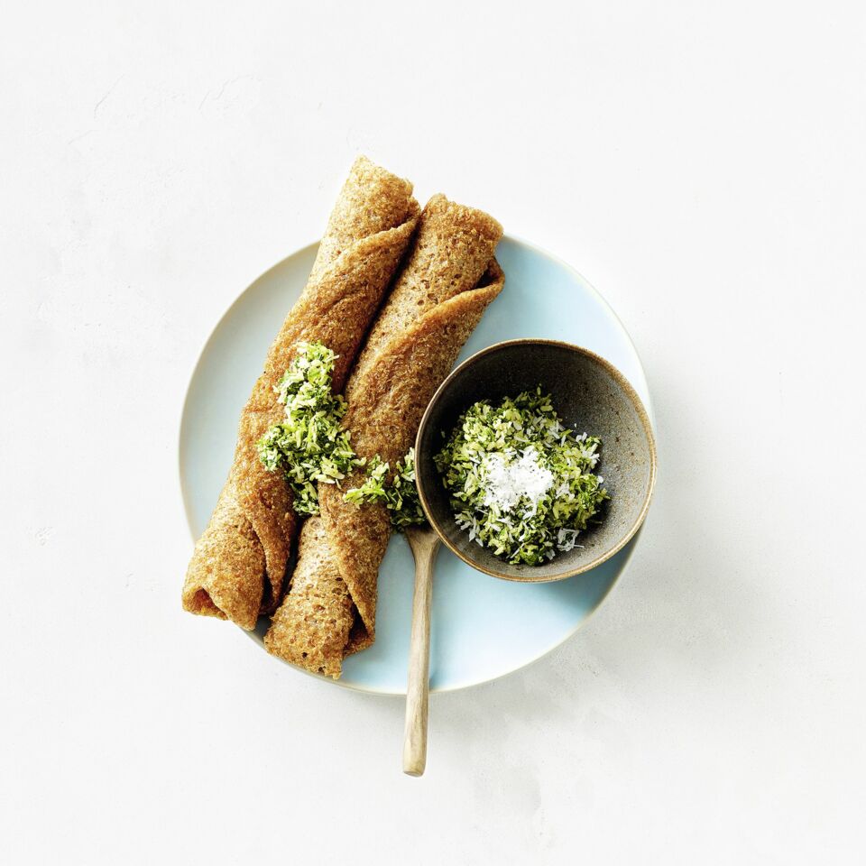 Chilischoten waschen, Stielansatz entfernen. Koriandergrün abbrausen, trocken schütteln und grob zerzupfen. Limettensaft auspressen. Chilis, Koriander, Kreuzkümmel, 4 EL Kokosraspel und ½ TL Salz in einen hohen Rührbecher geben und mit dem Pürierstab grob pürieren. Limettensaft unterrühren. Dip in eine Schale umfüllen und mit den restlichen Kokosraspeln garnieren. Pfannkuchen aufrollen, auf Tellern anrichten und mit dem Dip servieren.