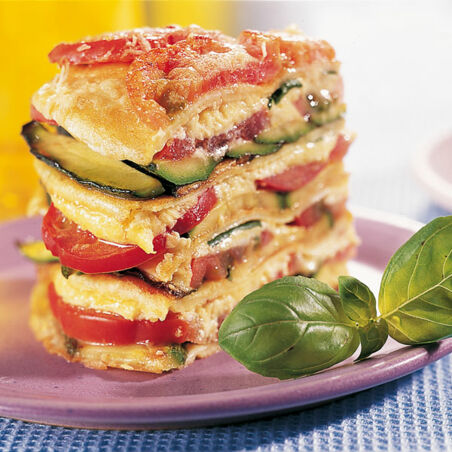 Den Backofen auf 200 Grad vorheizen. Jetzt braucht's eine runde hitzebeständige Form. Wer keine extra Auflaufform in Größe der Pfannkuchen hat, nimmt einfach die Springform. Die Pfannkuchen auf der Arbeitsfläche auslegen und mit der Ricottacreme bestreichen. Abwechselnd mit Zucchini- und Tomatenscheiben sowie Basilikum in die Form schichten. Zwischendurch mit Salz und Pfeffer würzen. Mit einer Schicht Tomaten abschließen. Übrigen Parmesan darauf streuen, mit dem restlichen Olivenöl beträufeln und auf der mittleren Schiene im Ofen (Umluft 180 Grad) etwa 35 Minuten backen. Kurz stehen lassen, zum Servieren wie eine Torte in Stücke schneiden.