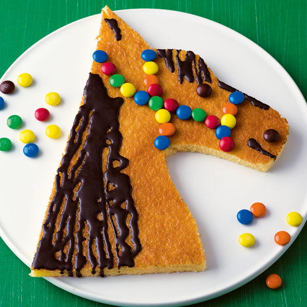Die fertige Kuchenplatte samt Backpapier auf ein Gitter gleiten lassen. Aus dem noch warmen Kuchen mit einem spitzen Messer einen Pferdekopf ausschneiden, dabei darauf achten, dass der Hals nach unten breiter zuläuft. Die nicht mehr benötigten Randteile entfernen. Den Pferdekopf auskühlen lassen.