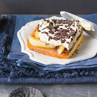 Für das Topping die Sahne, Vanillezucker und Sahnesteif mit den Quirlen des Handrührgeräts steif schlagen und auf den abgekühlten Kuchen streichen. Das Cappuccinopulver darübersieben.