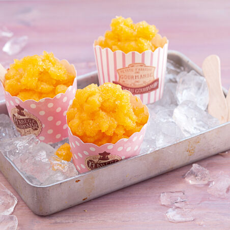 Nach ca. 2 Std. mit einer Gabel oder einem Schneebesen durchrühren. Diesen Vorgang noch drei- bis viermal alle 30 Min. wiederholen. Sobald das Granité fester wird, nur noch mit der Gabel auflockern. Das Granité mind. 8 Std. (oder am besten über Nacht) durchfrieren lassen. Das Pfirsichgranité mit einem Löffel von der Oberfläche abschaben und portionsweise servieren.