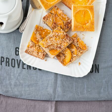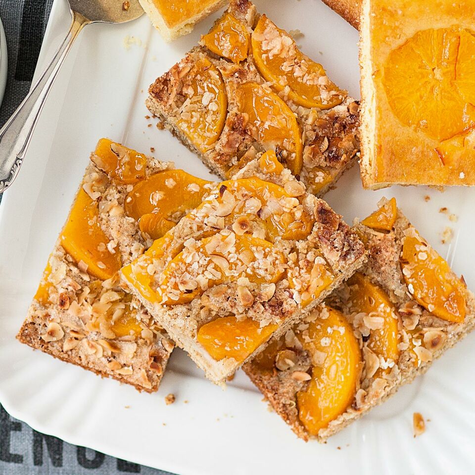 Den Teig auf das Blech geben und mit dem Teigschaber gleichmäßig verstreichen. Pfirsiche waschen, trocken tupfen, entsteinen, in Spalten schneiden und auf dem Teig verteilen. Mit gehobelten Haselnüssen, restlichen Haferflocken und übrigem Zucker bestreuen. Im Ofen (Mitte, Umluft 160°) in ca. 35 Min. goldbraun backen. Herausnehmen und auskühlen lassen.
