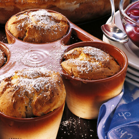 Das Gebäck aus der Form lösen und stürzen. Mit Puderzucker bestäuben und heiß servieren. Traditionell wird Kirschkompott dazu serviert.