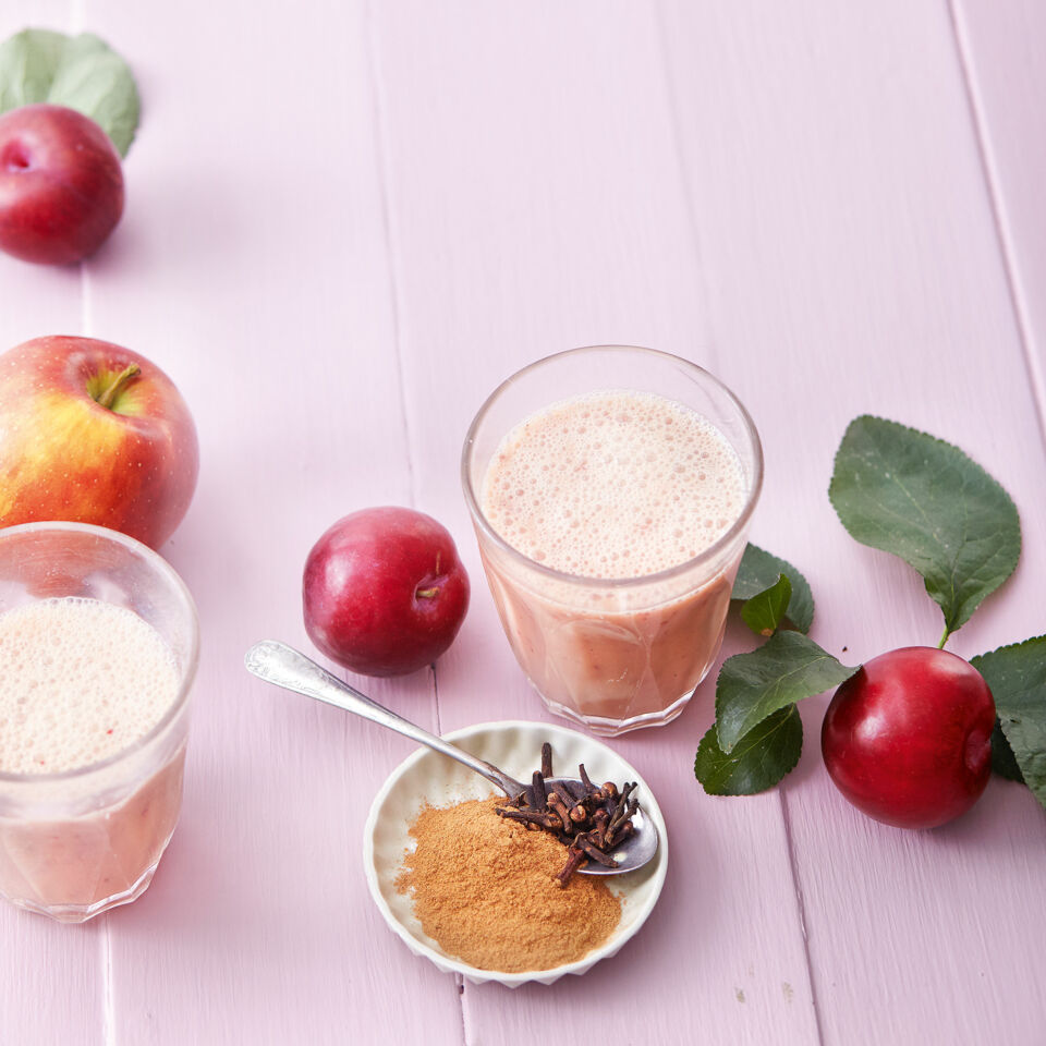 Das Obst in den Mixer füllen. Die Gewürznelken im Ganzen und den Zimt dazugeben, den Mandeldrink dazugießen und alles fein pürieren.