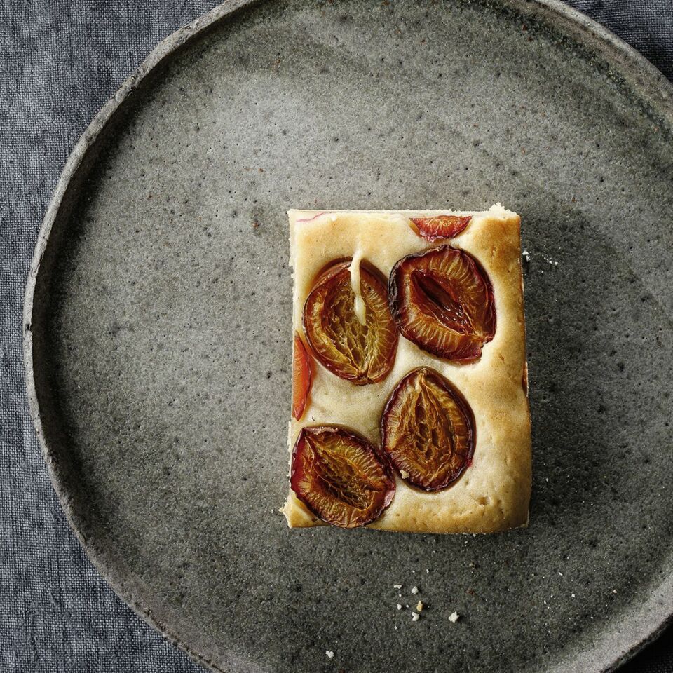 Den Teig in die Backform geben und glatt streichen. Die Pflaumen waschen, halbieren, entsteinen und gleichmäßig auf der Teigoberfläche verteilen. Dabei die Pflaumenhälften leicht in den Teig drücken. Den Kuchen im heißen Ofen (Mitte) in ca. 40 Min. goldbraun backen (Stäbchenprobe machen). Anschließend abkühlen lassen und in Stücke schneiden.