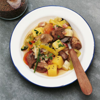 In einem Topf übrige Butter erhitzen und Fleisch darin ca. 3 Min. anbraten. Gemüse dazugeben und alles zugedeckt bei schwacher Hitze unter Rühren noch ca. 10 Min. schmoren. Den Eintopf sofort servieren.
