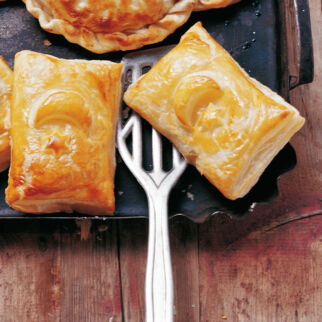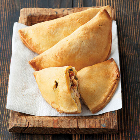Ofen auf 190° vorheizen. Den Teig 3 mm dick ausrollen. Mit einem Unterteller und einem spitzen Messer sechs Kreise von ca. 17 cm Ø ausschneiden. Die Füllung jeweils in die Mitte der Teigkreise setzen. Das Ei leicht verquirlen und die Teigränder damit bepinseln. Die Teigkreise halbmondförmig zusammenklappen und die Ränder mit einer Gabel festdrücken. Pastetchen mit Ei bestreichen und im Ofen (Mitte, Umluft 170°) in etwa 35 Min. goldbraun backen. Auf einem Kuchengitter abkühlen lassen.