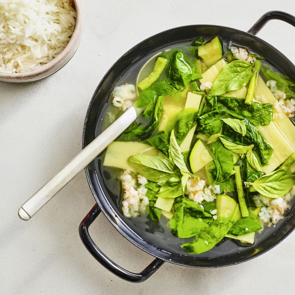 Dann Zucchini, Schlangenbohnen und Bambussprossen dazugeben und bei kleinerer Hitze 5 Min. mitköcheln lassen. Die Suppe mit Fischsauce und Salz abschmecken. Den Babyspinat und die Basilikumblätter bis auf einen kleinen Rest unterrühren und 2 Min. miterhitzen. Die Suppe auf vier Schalen verteilen, mit restlichen Basilikumblättern bestreuen und mit Reis servieren.
