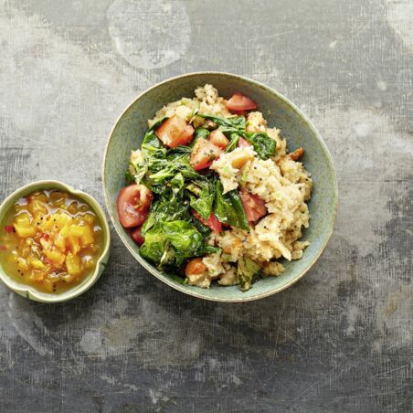 Spinat waschen, abtropfen lassen und hacken. Tomaten waschen, vierteln, von Stielansatz und Kernen befreien, klein schneiden. In einer Pfanne übriges Ghee erhitzen. Spinat darin ca. 2 Min. andünsten, die Tomaten und Curryblätter weitere ca. 2 Min. mitdünsten. Gemüse salzen, pfeffern und mit dem Grießbrei in vier Schalen anrichten.