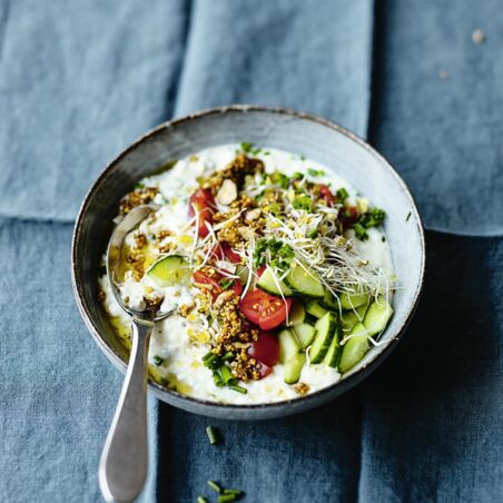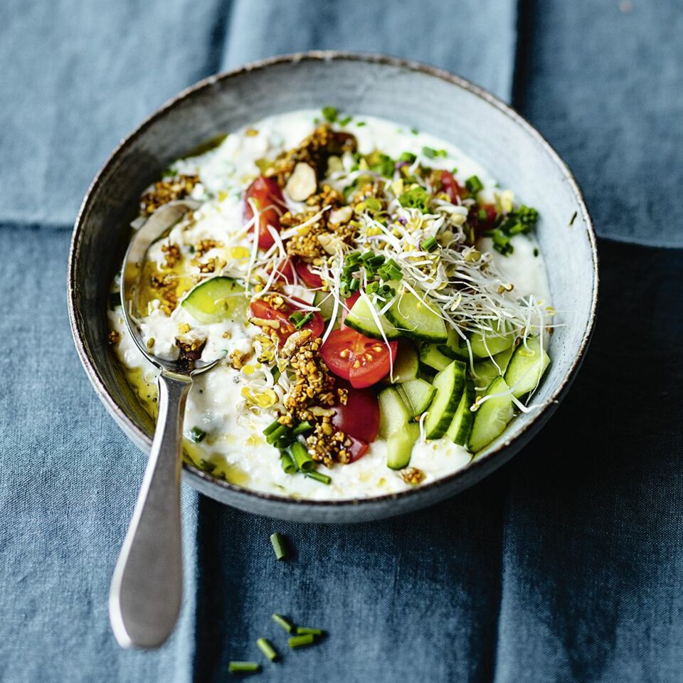 Müsli muss nicht immer süß sein. Das beweist dieses herzhafte Müsli mit körnigem Frischkäse und Gemüse.