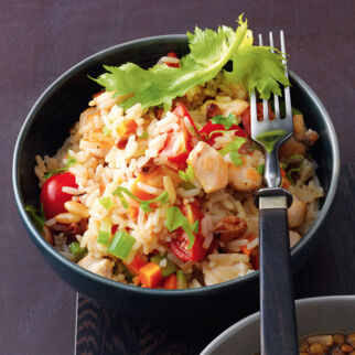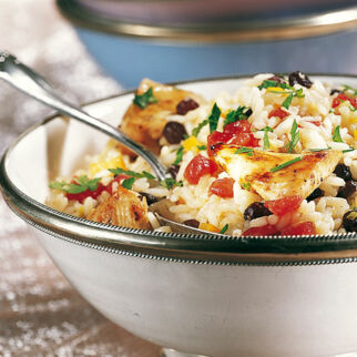 Das orientalische Reisgericht kann in vielen Varianten zubereitet werden. Wir rühren Hähnchenwürfel und Korinthen unter den Reis.