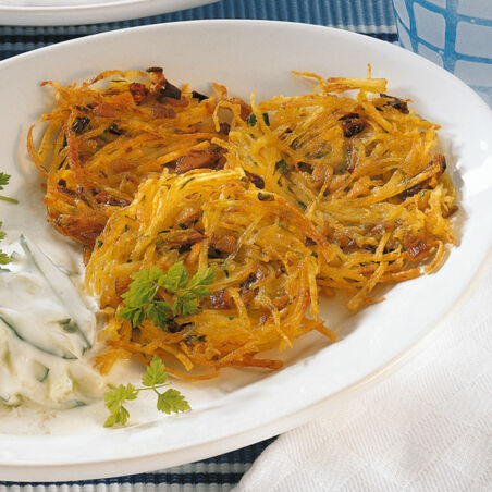 Butter und Öl nach und nach in einer großen Pfanne erhitzen. Von der Kartoffelmasse mit einem Esslöffel kleine Pflänzchen hineinsetzen und bei mittlerer Hitze pro Seite 4-5 Min. braten.