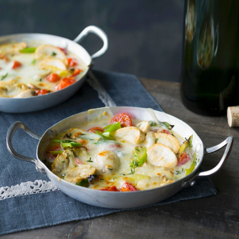 Den Parmesan auf den Zutaten verteilen. Den Mozzarella abtropfen lassen, in dünne Scheiben schneiden und auf die Pilzmischung verteilen. Die Gratins im Ofen (Mitte) etwa 20 Min. überbacken, bis sie schön gebräunt sind. Das Gratin mit frischem, knusprigem Baguette servieren.
