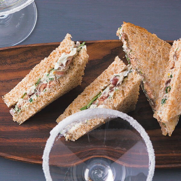 5 Toastscheiben mit der Pilzcreme bestreichen, Rucola darauflegen und mit den übrigen Toasts abdecken. Die Ränder mit einem scharfen Messer entfernen und die Doppeltoasts diagonal teilen.