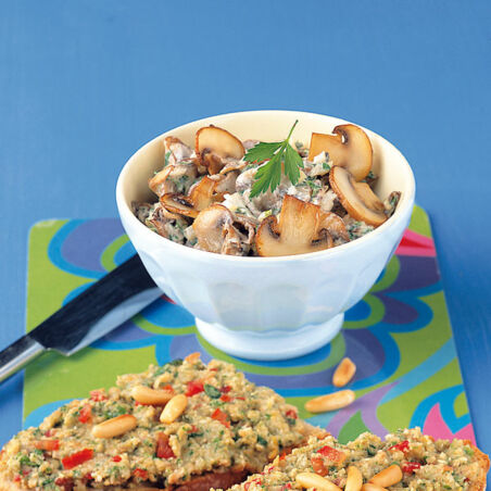 Die Zwiebel schälen und fein würfeln. Zwiebel, Pilze und Sojacreme in einer Schüssel vermengen. Den Aufstrich salzen, pfeffern und mit der Petersilie bestreuen. Am gleichen Tag aufbrauchen.