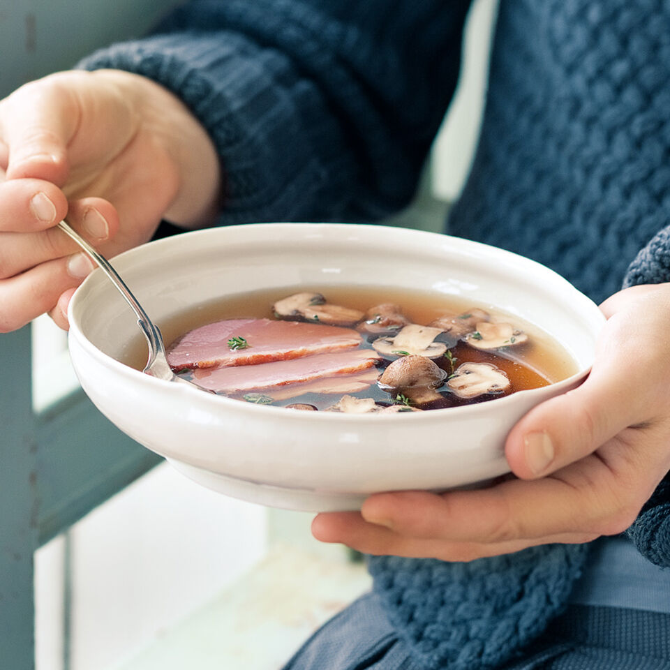 Als edle Vorspeise für ein feines Menü macht diese Pilzbouillon mit Entenbrusteinlage so einiges her.