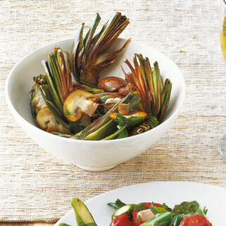 Das restliche Öl im Wok erhitzen, Pinienkerne darin anbraten und wieder herausnehmen. Dann die Pilze bei starker Hitze 3-4 Min. braten, Petersilie untermischen, den Knoblauch dazupressen. Kurz braten, dann mit Salz und Pfeffer abschmecken.