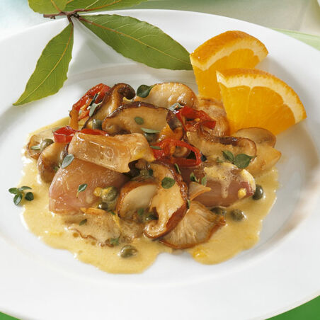 Die Orangen auspressen. Saft mit Sahne zu den Pilzen geben. Mit Kapern und Zucker würzen und cremig einkochen lassen, salzen.