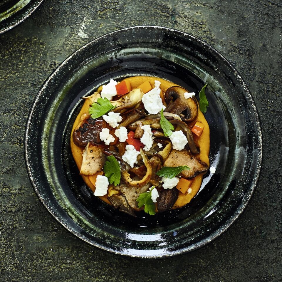 Anrichten: Das Kürbispüree auf Teller verteilen und glatt verstreichen. Den eingelegten Kürbis aus dem Sud heben und auf das Püree setzen. Darauf die Pilze und den Ziegen-Feta anrichten.