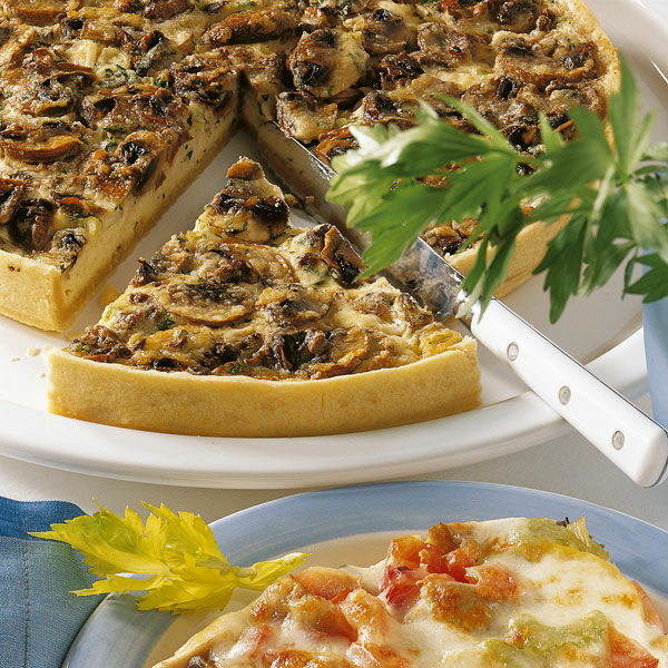 Steinpilze abtropfen lassen, fein schneiden. Mit Champignons, Zwiebelringen und Petersilie mischen, salzen, pfeffern und auf den Teig geben. Eier mit Käse und Sahne gut verquirlen und darüber gießen. Die Quiche im Ofen (Mitte, Umluft 180°) etwa 45 Min. backen.