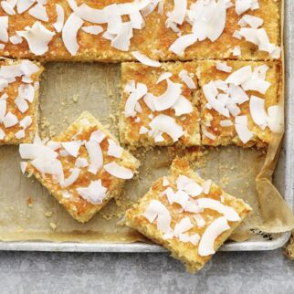 Den Pudding auf dem Flammkuchenteig verstreichen. Die Ananaskonfitüre teelöffelweise daraufsetzen und die Kokosraspel darüberstreuen. Den Flammkuchen im heißen Ofen (unten) ca. 12 Min. backen.