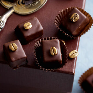 Den Rahmen lösen, die Ganache in 30 Würfel schneiden. Zum Überziehen die Kuvertüre hacken, schmelzen und temperieren. Die Pralinen damit überziehen, auf Backpapier setzen und je 3 Pinienkerne in die Kuvertüre drücken.