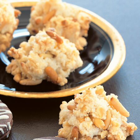 100 g Pinienkerne grob hacken. Gehackte Pinienkerne, Mandeln, Speisestärke, Zucker und Zitronenschale mischen. Den Backofen vorheizen. Die Backbleche mit Backpapier belegen.