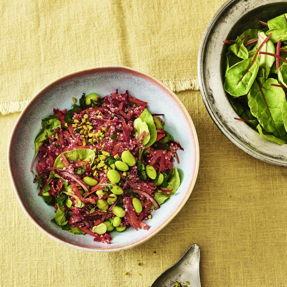 Quinoa, Edamame, Rote Bete, Möhre und Dressing in einer Schüssel mischen, 15-20 Min. ziehen lassen. Mangold und Petersilie unterheben, erneut 5 Min. ziehen lassen und mit Salz, Pfeffer und Zitronensaft abschmecken. Vor dem Servieren mit Sumach und Pistazien bestreuen.
