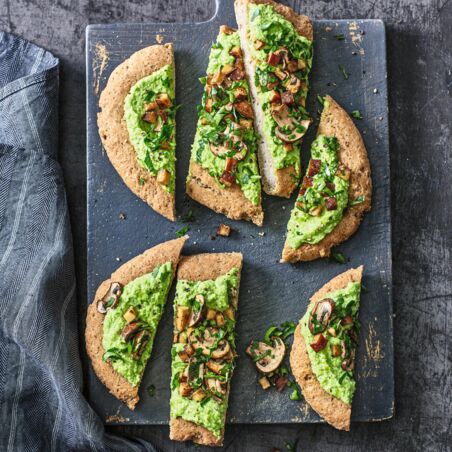 Teiglinge mit den Fingern leicht eindrücken, mit dem übrigen Öl (50 ml) beträufeln und je 2 Pinsas in je 6-8 Min. im heißen Ofen hellbraun backen. Herausnehmen, kurz ausdampfen lassen. Mit der Edamame-Creme bestreichen und mit der Tofu-Pilz-Mischung belegen.