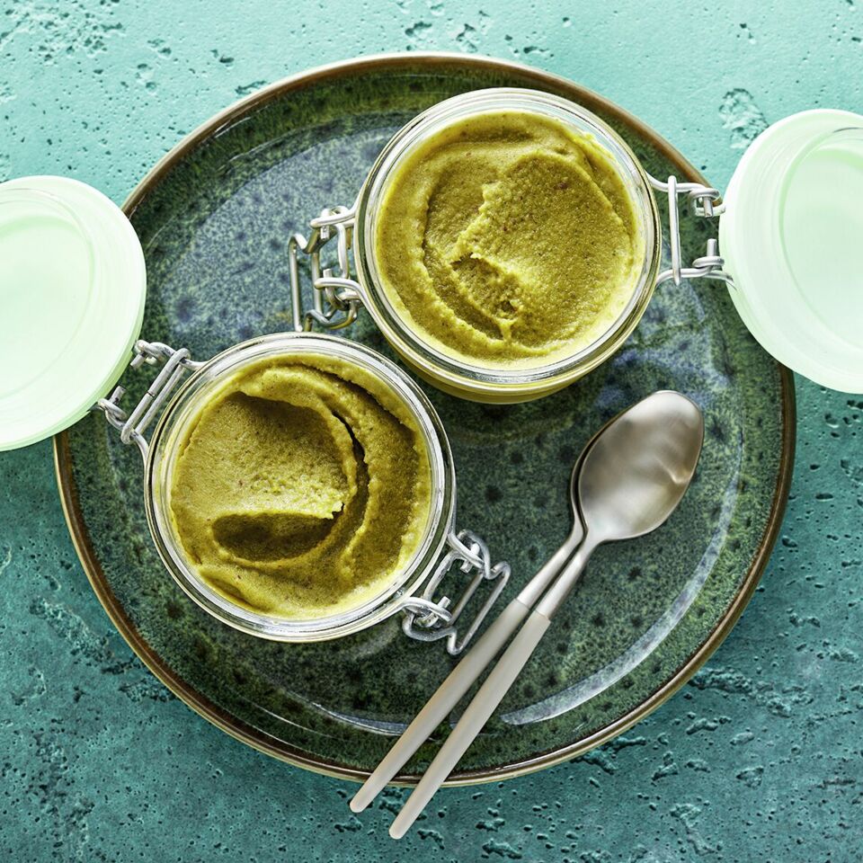 Ohne Eismaschine die Pistazienmasse in 1-2 Eiswürfelformen füllen und ca. 6 Std. tiefkühlen. Danach die Würfel aus der Form lösen und im Hochleistungsmixer fein zerkleinern. Das Eis in vier Schälchen anrichten und sofort servieren.