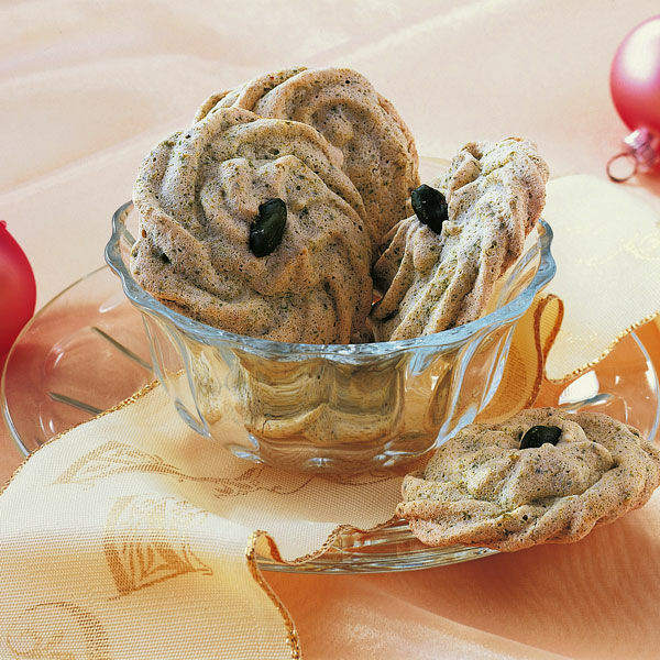 Masse in Spritzbeutel mit großer Sterntülle füllen und Häufchen auf die Oblaten spritzen. Jeweils eine Pistazie darauf setzen und im Ofen (Mitte) 20-25 Min. backen.