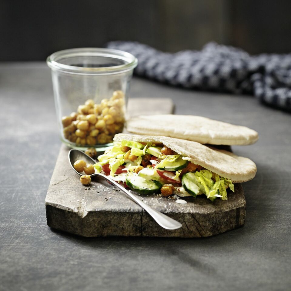 Hier kommen geröstete Kichererbsen und reichlich Salat in die Brottasche – schmeckt nicht nur extrem lecker, sondern ist auch leichter als die klassische Variante mit frittierten Falafeln.