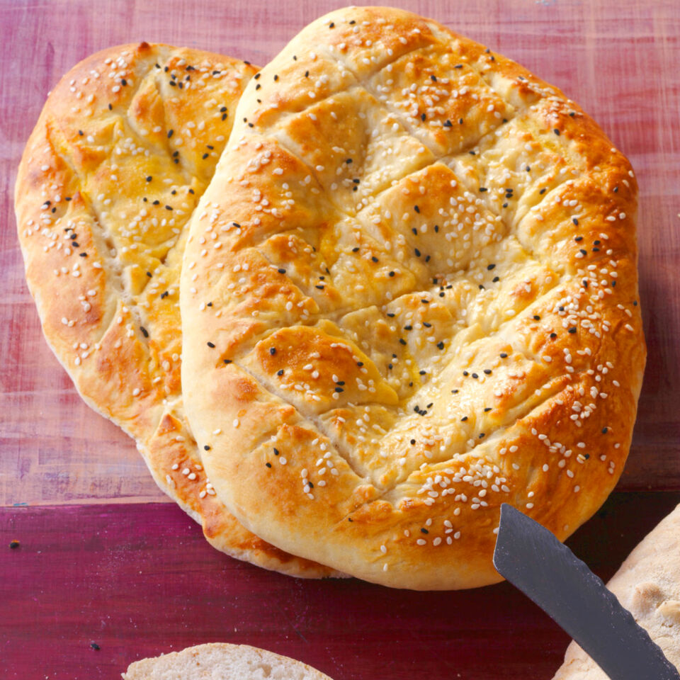Eigelb mit 1 EL Olivenöl und Zucker verrühren, Fladen damit bepinseln. Mit Sesam und Schwarzkümmel bestreuen. Im heißen Ofen (Mitte) in 12-15 Min. hellbraun backen. Herausnehmen und warm servieren.