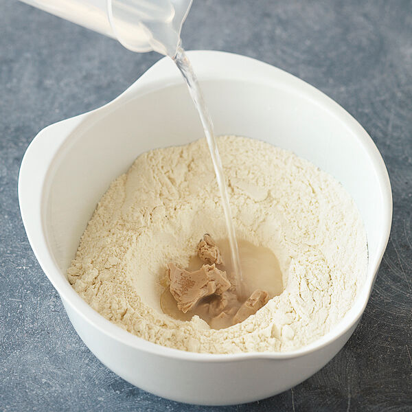 Das Mehl in eine Schüssel geben, in die Mitte eine Mulde drücken. Die Hefe hineinbröckeln, mit Zucker bestreuen und mit 125 ml lauwarmem Wasser und etwas Mehl glatt rühren. Den Vorteig zugedeckt an einem warmem Platz mindestens 15 Min. gehen lassen.