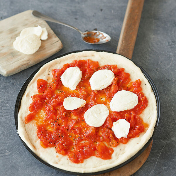 1 TL Salz und 2 EL Öl auf den Mehlrand geben und alles mit 125 ml lauwarmem Wasser 10 Min. verkneten, bis der Teig glänzend und geschmeidig ist. Den Hefeteig zugedeckt an einem warmen Platz mindestens 30 Min. gehen lassen.