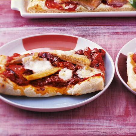 Den Teig dünn ausrollen und mit Sugo oder Salsa bestreichen. Mit Zwiebel, Tomaten, Forelle und Mozzarella belegen. Mit Salz und Pfeffer würzen. Im Ofen (unten) etwa 10 Min. backen.