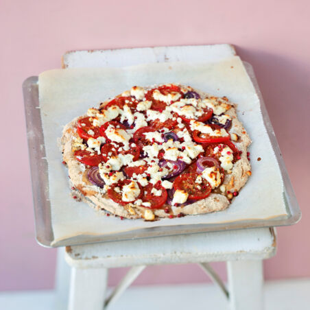 Teig noch mal kurz durchkneten und auf dem gefetteten Backblech dünn zu einem Fladen (30-35 cm groß) ausrollen. Tomatenscheiben und Zwiebel auf dem Teig verteilen. Mit Salz, Pfeffer und Oregano würzen. Ziegenfrischkäse gleichmäßig über der Pizza zerbröckeln. Mit Honig oder Ahornsirup beträufeln.
