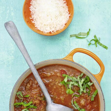 Die Tomaten und 400 ml Wasser dazugeben. Alles aufkochen und ca. 15 Min. köcheln lassen, dabei ab und zu umrühren. Mit Salz und Pfeffer abschmecken. Basilikum waschen, trocken schütteln und in dünne Streifen schneiden. Die Suppe mit Basilikum und nach Belieben mit Parmesan servieren. Dazu schmeckt knuspriges Baguette.