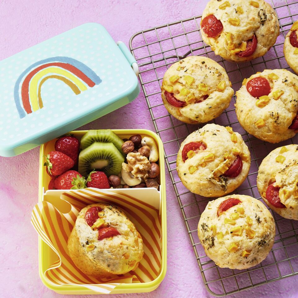 Das Obst waschen, abtrocknen und ggf. zerkleinern oder entkernen. Jeweils 1 Muffin mit 1 Handvoll Obst und 1 Handvoll Nüssen in jede Brotbox geben. Die übrigen Muffins anderweitig verwenden oder tiefgefrieren - sie lassen sich über Nacht auftauen und dann auf dem Toaster aufbacken.