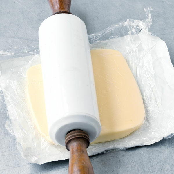 Für den Butterteig das Butterpaket öffnen und die Butter auf dem Butterpapier liegen lassen. Mit einem aufgeschnittenen Gefrierbeutel bedecken. Die Butter mit dem Nudelholz zu einer etwa zentimeterdicken Platte (ca. 20 x 20 cm) ausrollen. Mit dem Gefrierbeutel bedeckt 20 Min. kalt stellen.