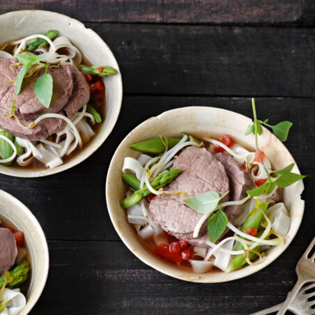 Das Thai-Basilikum abbrausen, trocken schütteln und die Blätter abzupfen. Die Nudeln in ein Sieb abgießen, gut abtropfen lassen und auf Schälchen verteilen. Das Gemüse und je 2 Scheiben Rinderfilet daraufgeben. Mit Salz und Pfeffer bestreuen und die heiße Brühe darüber verteilen. Das Basilikum über das Fleisch streuen und nach Belieben etwas Chilisauce darüberträufeln.